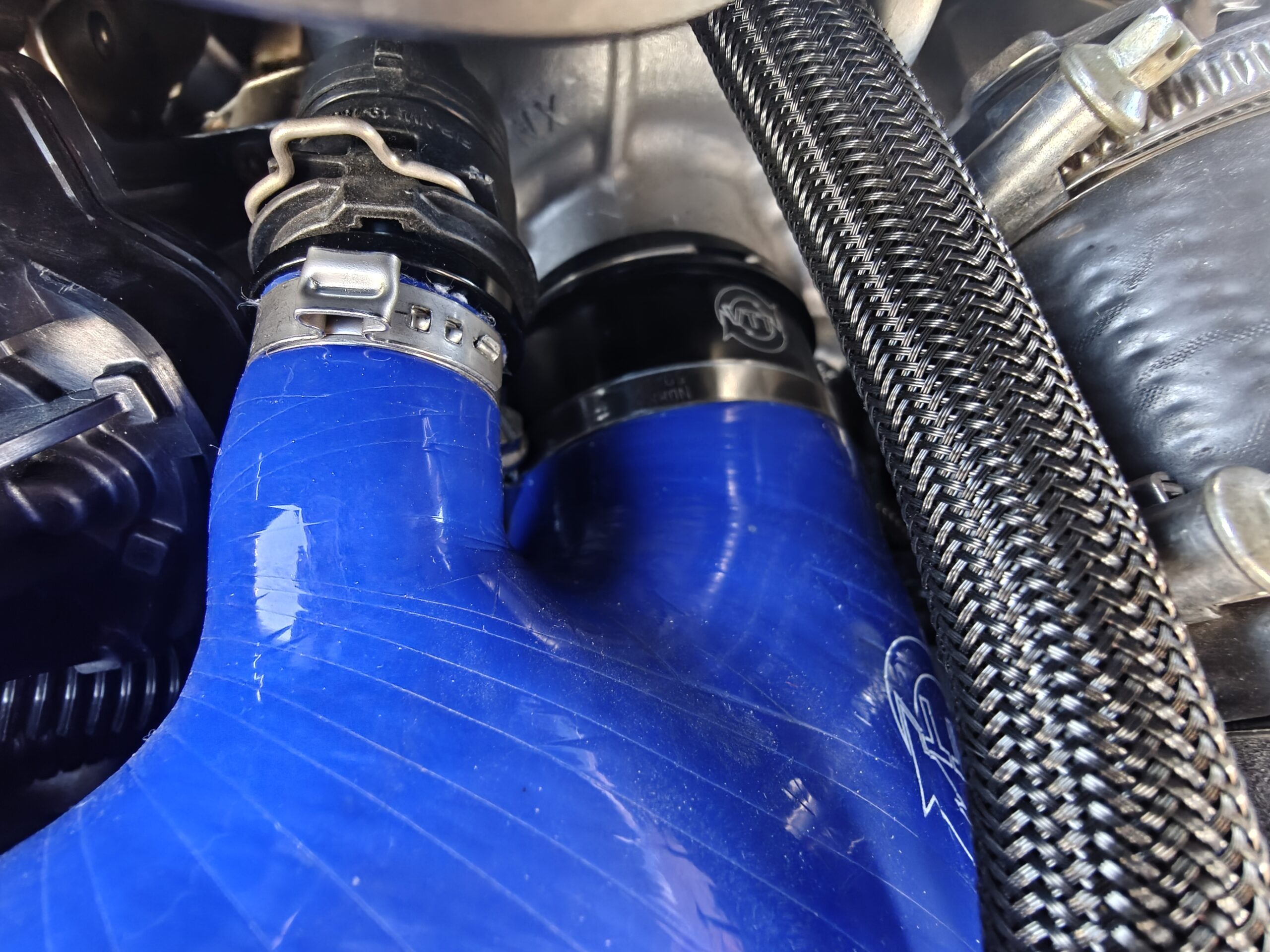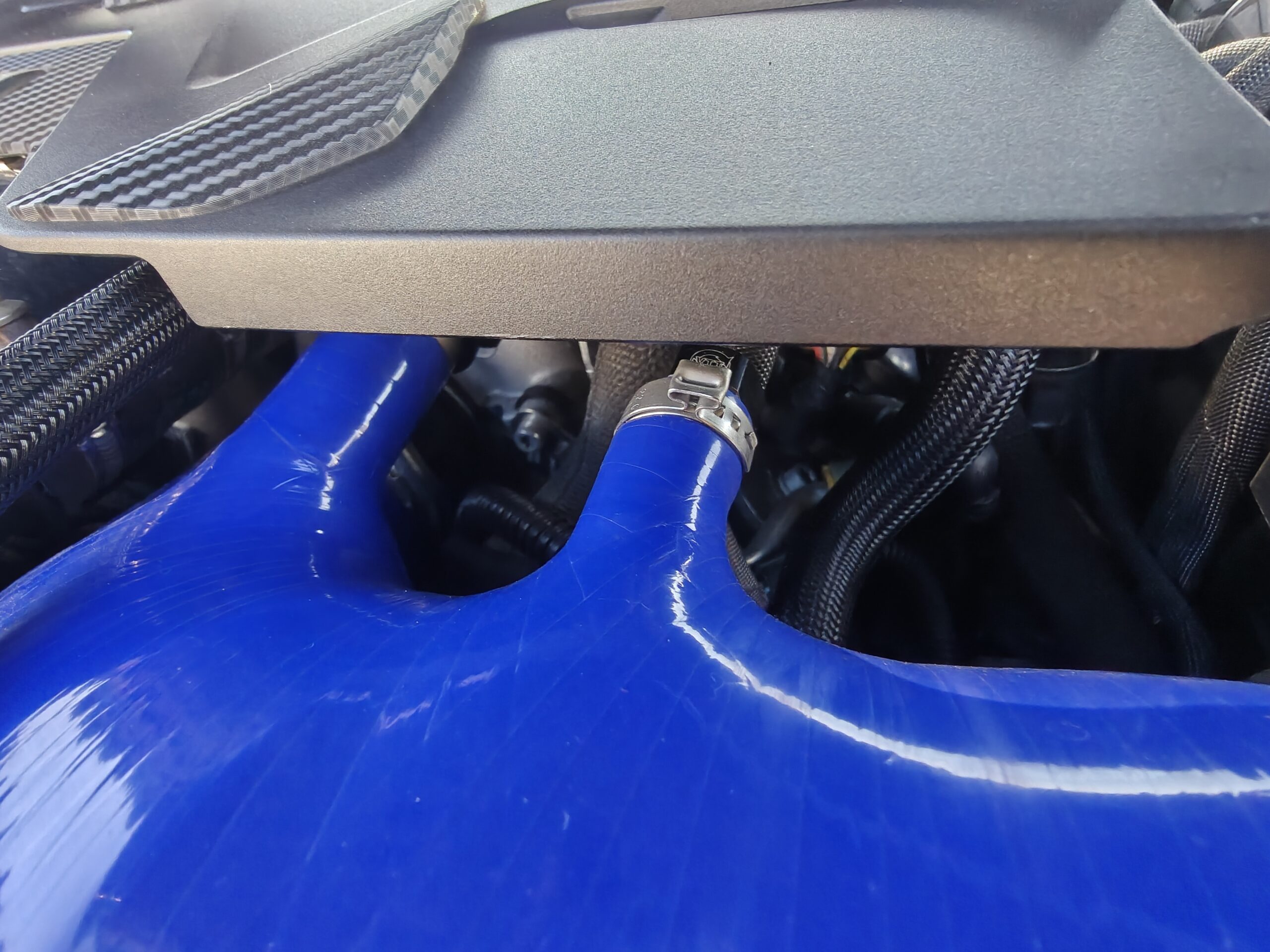 On the S63 platform, the most significant intake restriction is not the airbox lid or filter—it is the factory molded plastic turbo-side inlet pipe. This pipe necks down aggressively right at the turbocharger inlet, exactly where airflow demand is highest. The result is inlet depression and pressure loss before the compressor ever sees volume.