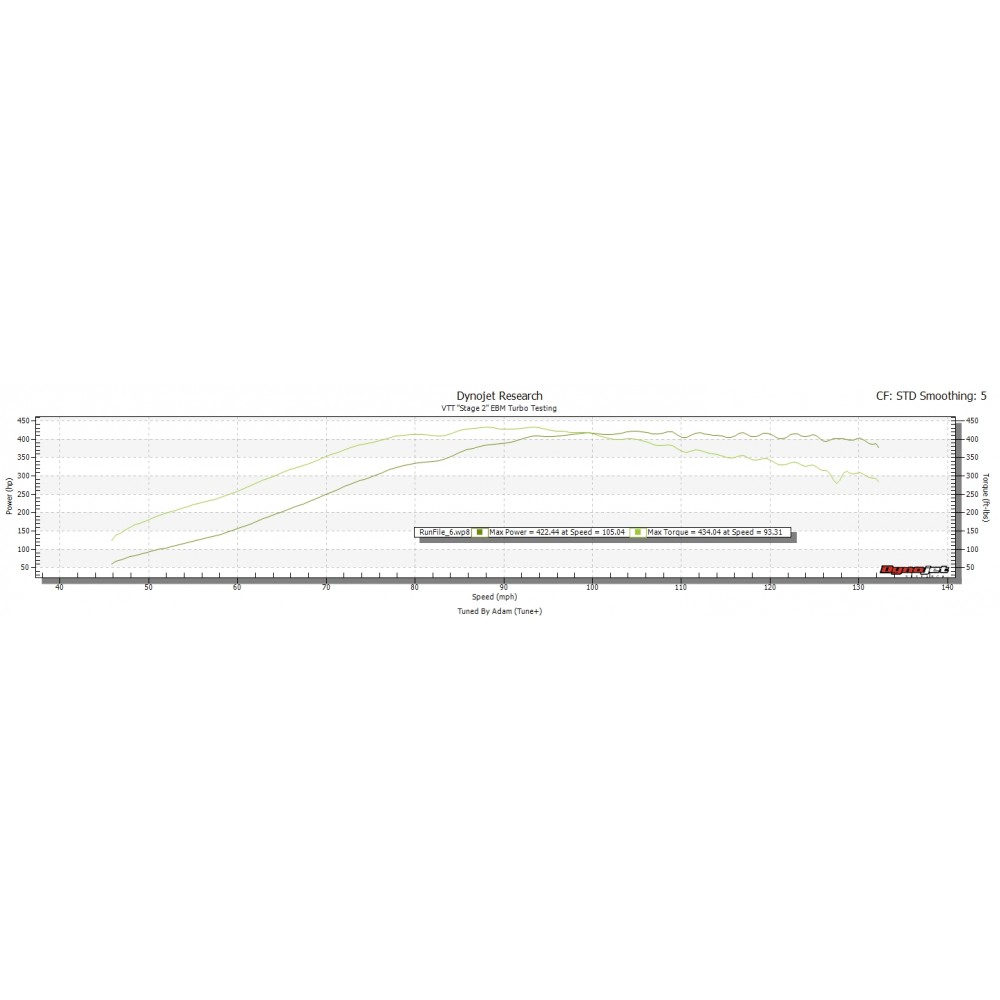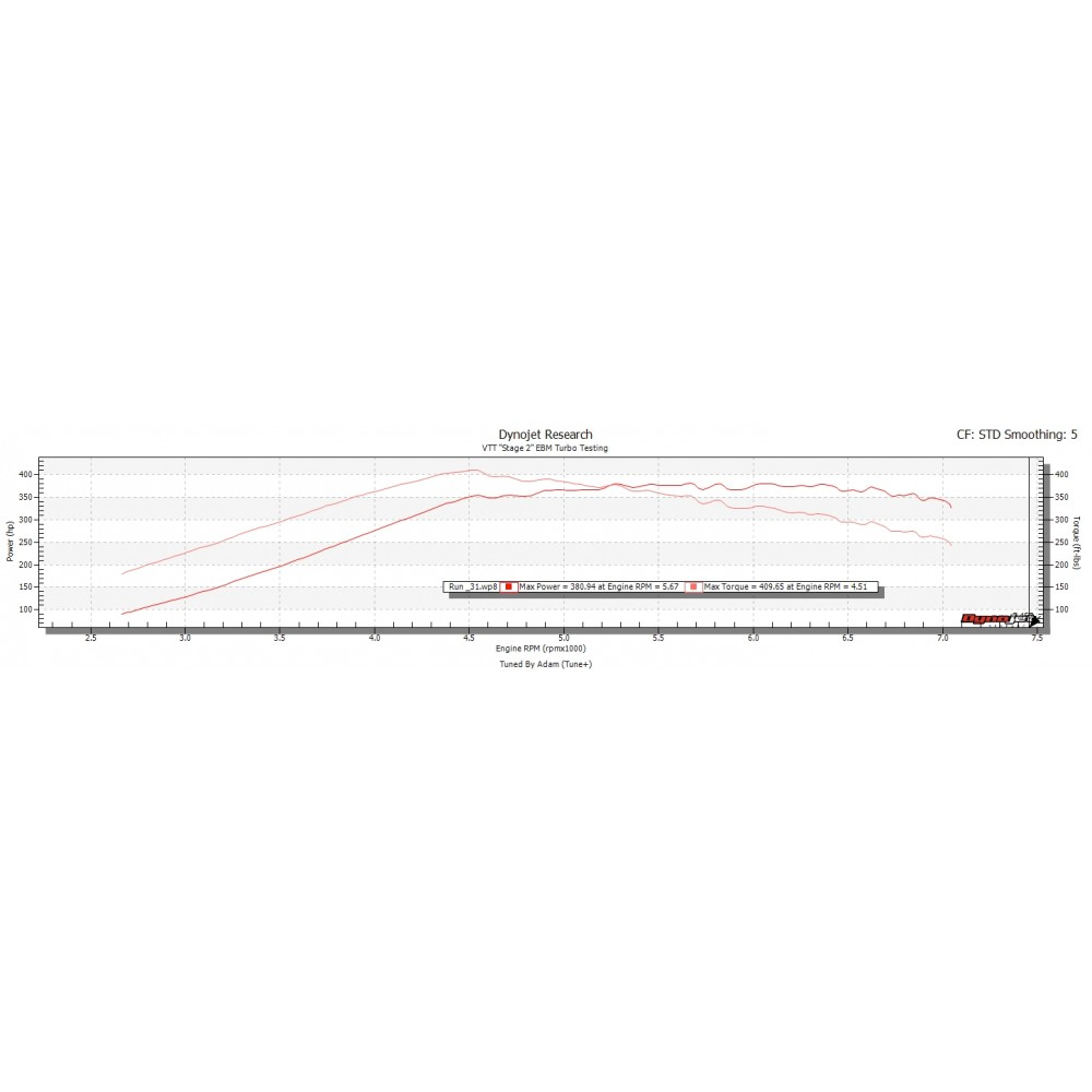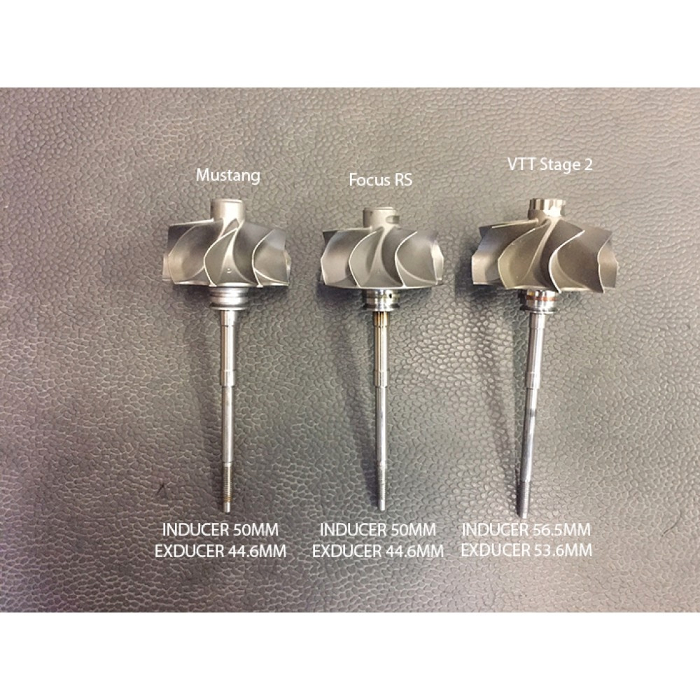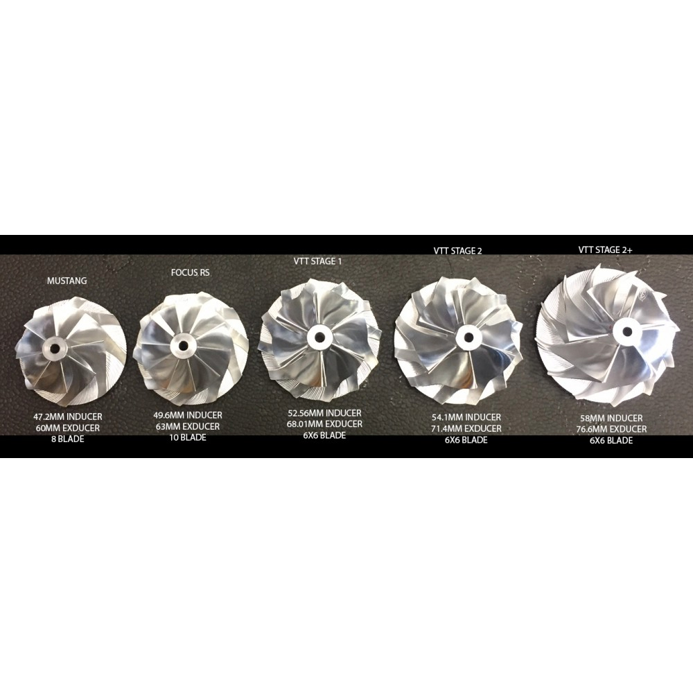 We are proud to introduce the latest in our line of Ecoboost turbocharger products the VTT EB Stage 2 turbocharger. This is a new EB turbocharger from the ground up, using 100% new parts throughout. Some of the groundbreaking features are fully new turbocharger from the compressor housing to the bearing housing, to the turbine housing, we had them engineered to fit in the stock location, but provide the full flow of a much larger turbo. Every part on these turbos was designed around our specific goals for power, flow, and reliability. What we ended up with is a turbocharger, that can utilize the stock location while providing enough flow for 550WHP. To do this we increase the area inside not only the manifolds, but also the turbine, and compressor housings, we also slightly increase AR ratio on the turbine housing to free up even more flow, while not giving up anything in spool. To put it bluntly, there is no other 550-600WHP capable turbocharger option on the market that can match the spool, ease of fitment, power or reliability of our EB Stage 2 / 2+Ā turbocharger!
