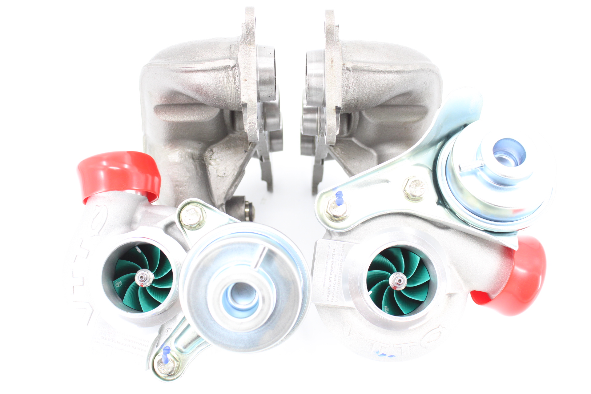 VTT Billet compressor wheel option: Every set of VTT Stage 2 upgrade comes with the amazing VTT Billet Compressor wheel option. These are fully forged billet wheels, utilizing an ultra-efficient 9 blade wheel design as well as “extended tip technology” to increase airflow a solid 20% over the cast 15T wheels. This also helps the turbos work less hard to make the same power, as shown by our Shaft speed testing. All Stage 2 turbo comes with Green Anodized wheels