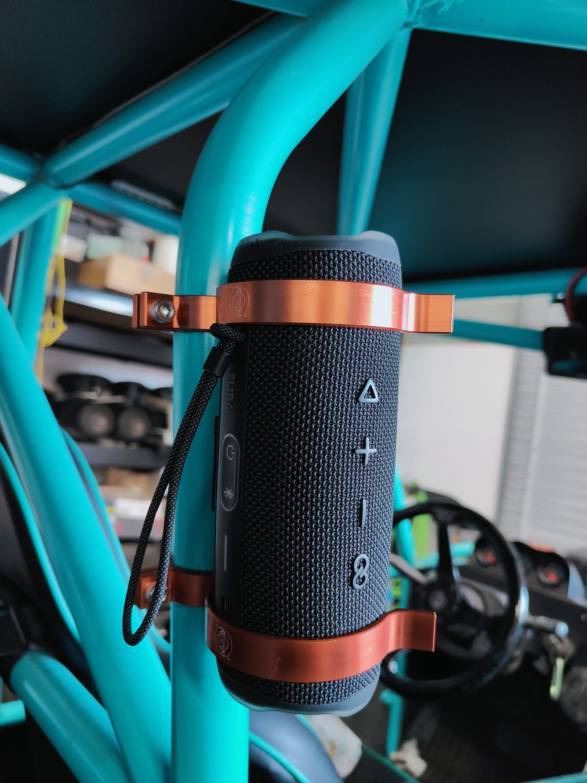 VTT is happy to offer our very unique and universal billet mount to fit any roll bar or cage with  1.5″, 1.75″, or 2″ diameter tubing. These mounts are designed from 6061-T6 aluminum and are made to SECURELY hold a JBL Flip version 3 – Version 6 and allows you to bring music into your race car, off-road vehicle, rock crawler, boat, basically anything that has a length of tubing this will allow you to have an easy way to have tunes without having to install and mount a stereo system.