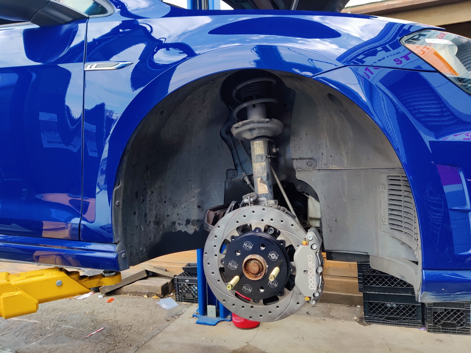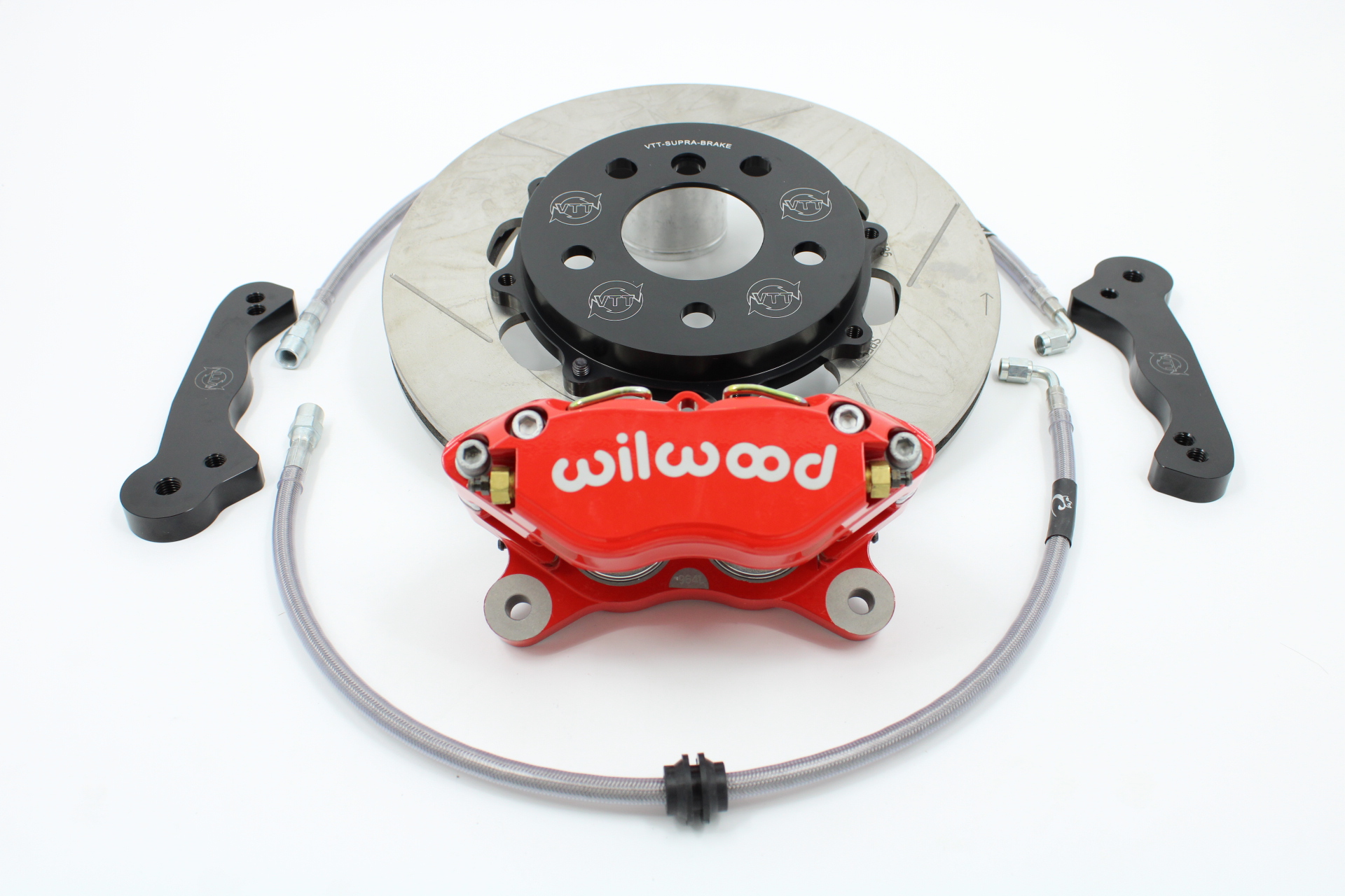 The kit is a true plug-and-play setup using VTT parts, coupled with DOT-approved brake lines, CNC rotor hats/brackets, and a CEL eliminator harness for the brake sensor.