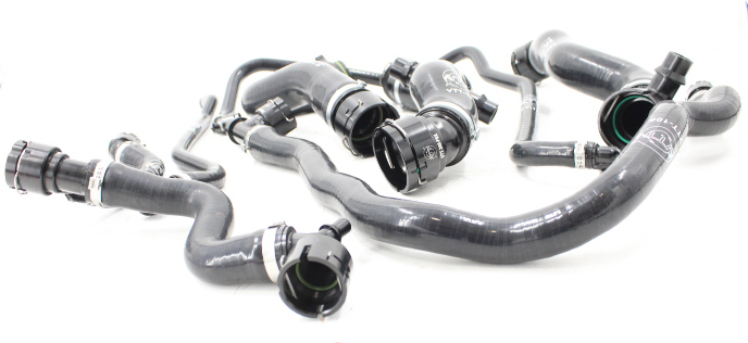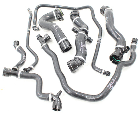 This kit is designed as a direct replacement for multiple factory coolant hoses and connector assemblies shown in the OEM BMW cooling system diagram.